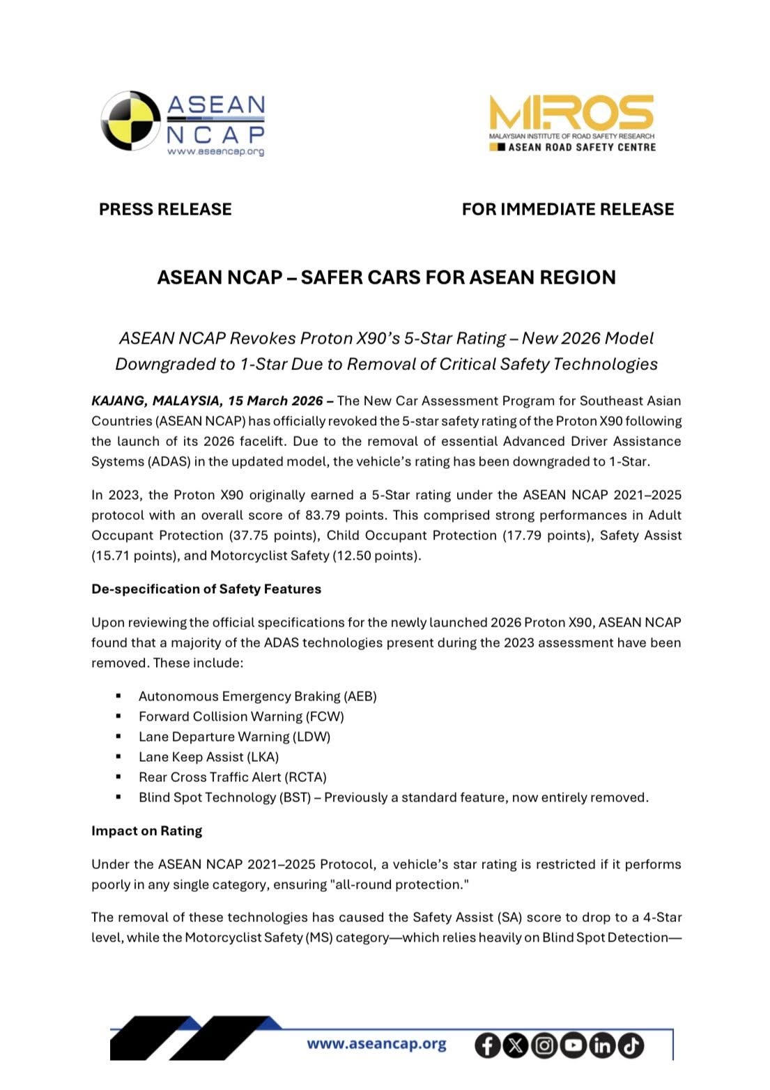 “Safety must be a priority accessible to all, not a luxury. ASEAN NCAP will continue to monitor all rated manufacturers; we will not hesitate to revoke the ratings of any brand that compromises vehicle safety post-assessment,” he continued.