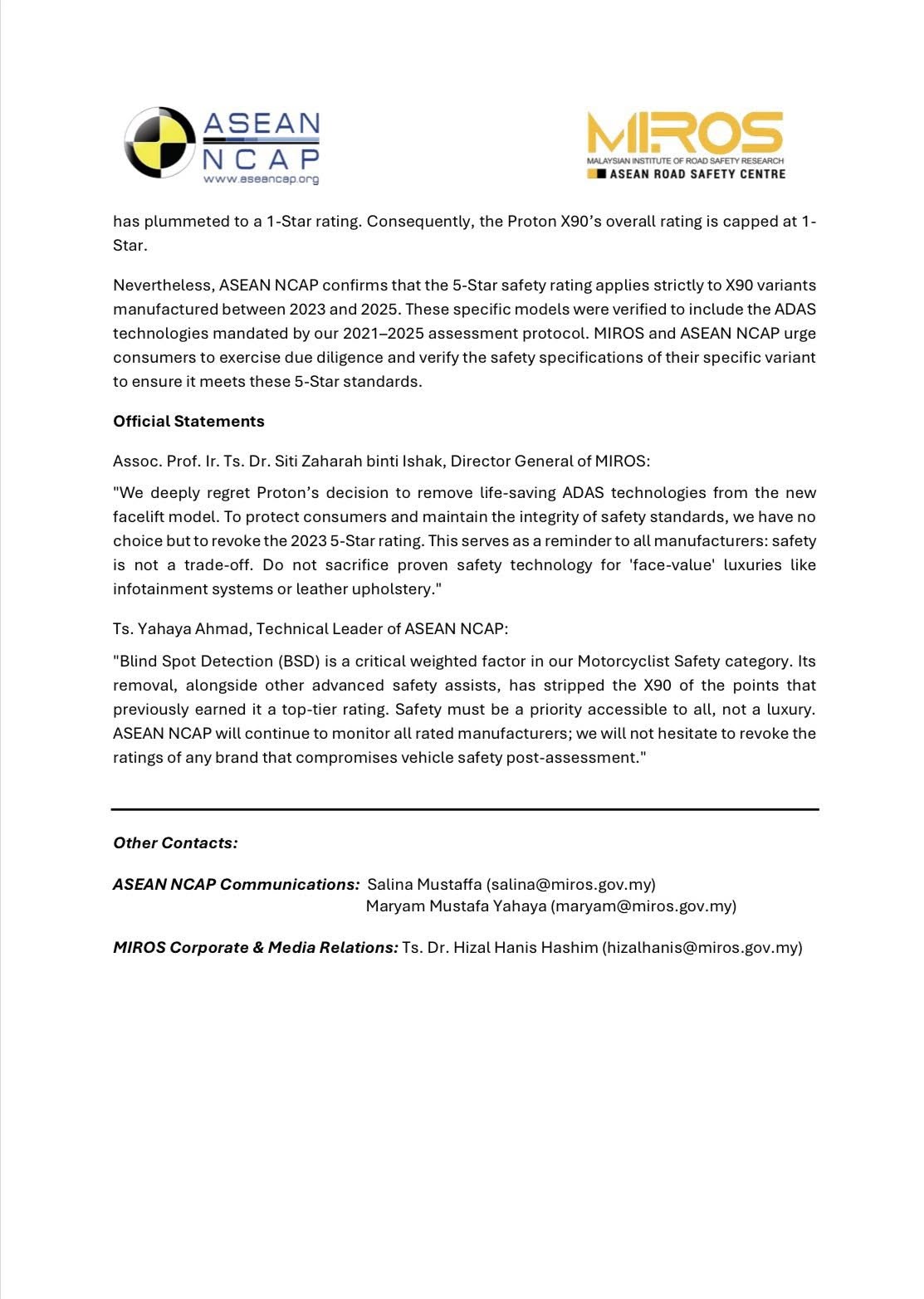 “We deeply regret Proton’s decision to remove life-saving ADAS technologies from the new facelift model (X90). To protect consumers and maintain the integrity of safety standards, we have no choice but to revoke the 2023 5-star rating.