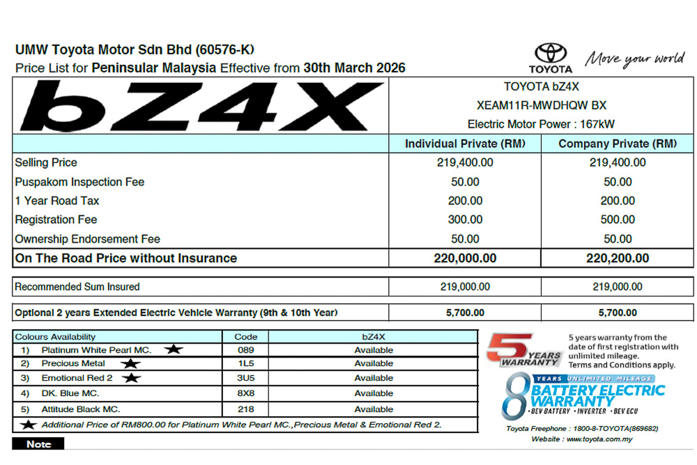 As for the bZ4X, the 2026 updated version was also shown at BIMS 2026 last week, where Thai buyers get to choose from two variants—FWD (THB 1.529 million/RM187,335) and AWD (THB 1.649 million/RM202,038).