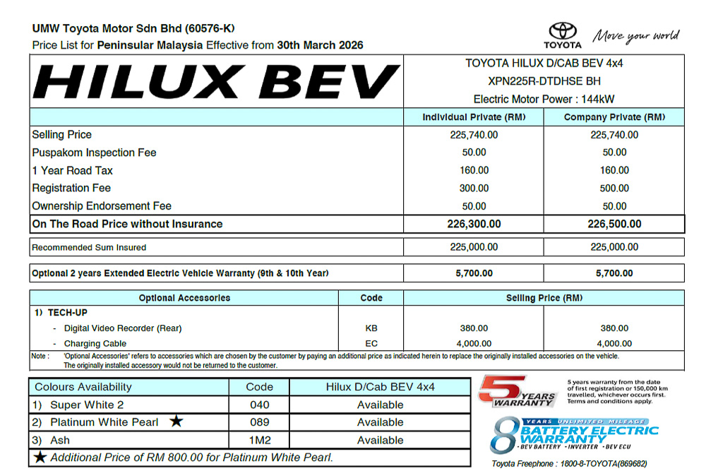 Beginning with the new Hilux EV, this all-electric pick-up truck is simply known as the Toyota Hilux Travo-e in the Thai market, where it is offered in a single double-cab dual-motor variant priced at THB 1.491 million (RM182,680). And should its leaked price tag of RM226,300 be true, this means that Malaysians will be paying more than RM40,000 extra for the same pick-up truck as the Thais.